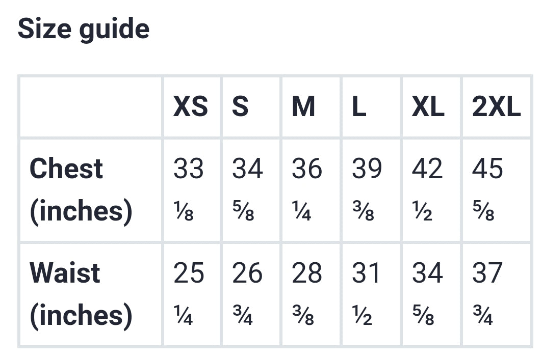 | Chest (inches) | 33 ⅛ | 34 ⅝ | 36 ¼ | 39 ⅜ | 42 ½ | 45 ⅝ |