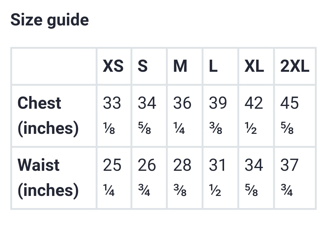 | Chest (inches) | 33 ⅛ | 34 ⅝ | 36 ¼ | 39 ⅜ | 42 ½ | 45 ⅝ |